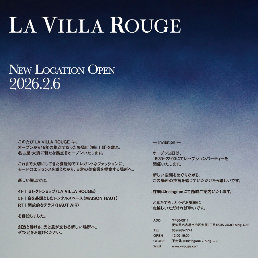 "VILLA ROUGE" was established on March 3, 2011, in Sakae, Nagoya, based on the concept of aesthetics to enjoy the latest global collections